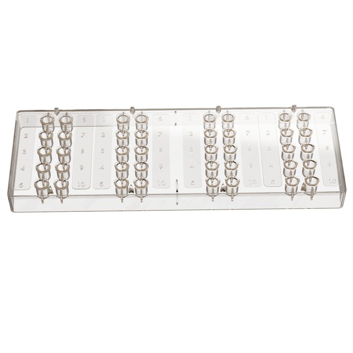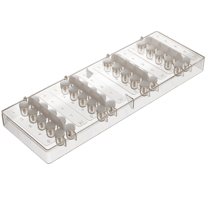 Designed for professional allergy testing environments, this durable clear plastic tray provides an organized and efficient solution for managing allergen extracts and test applicators. The 40 precisely molded slots allow for secure placement and easy identification of each vial or test sample during allergy screening procedures. The translucent design enables clear visibility of extract levels, helping clinicians monitor usage and ensure timely replacement of materials. Crafted from high-quality medical-grade plastic, the tray is lightweight yet sturdy, ensuring stability and cleanliness during testing sessions. Its ergonomic layout enhances workflow efficiency, keeping all necessary materials within easy reach. Ideal for use in hospitals, allergy clinics, and diagnostic laboratories, this 40-slot tray supports consistent and reliable testing procedures while maintaining professional organization.